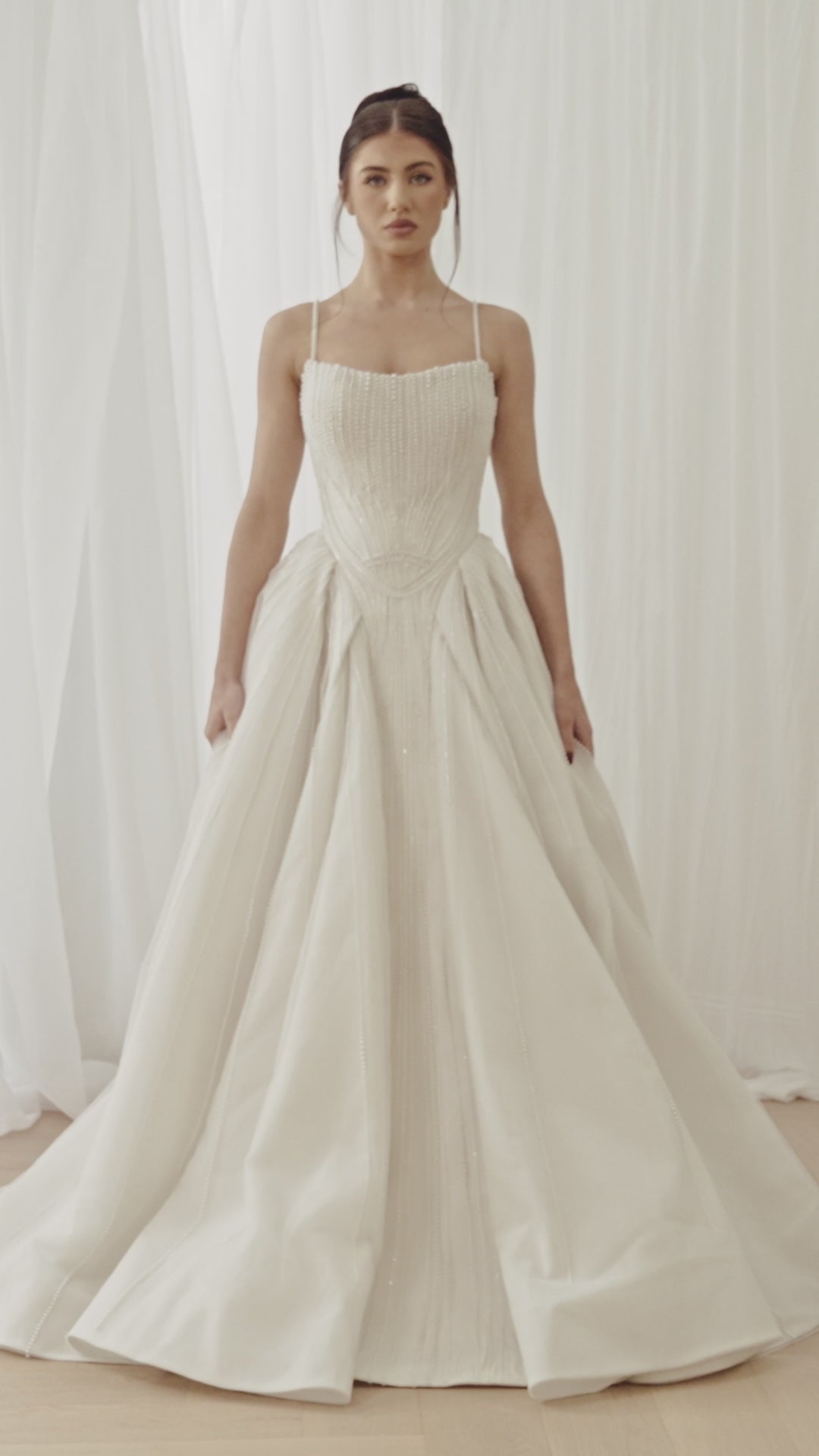Céleste is a modern ballgown with celestial presence. Its structured corset bodice is finely hand-beaded in linear motifs that sculpt and elongate, before cascading into a voluminous silk skirt with deep pleats that create movement and grandeur. Delicate straps frame the neckline, balancing the strength of the silhouette with a touch of softness. This gown radiates understated opulence, designed for the bride who wants to command the room with quiet power.