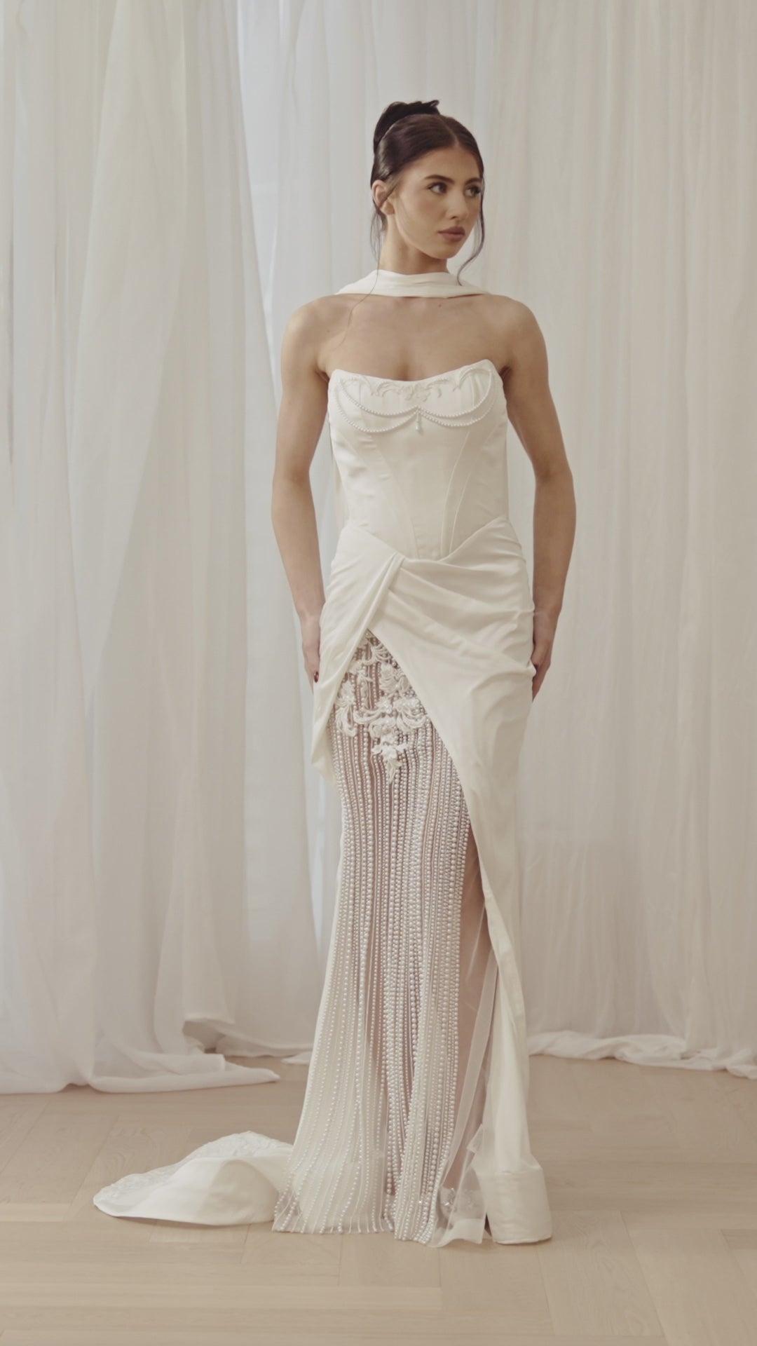 Célestine is a daring ode to couture seduction. The sculpted corset bodice shapes the waist with architectural precision, while soft draping cascades into a front split to reveal a beaded lace underskirt shimmering with pearl and lace detail. Finished with a detachable silk scarf neckline, this gown offers drama, movement, and modern sensuality. Designed for the bride unafraid to redefine bridal elegance.