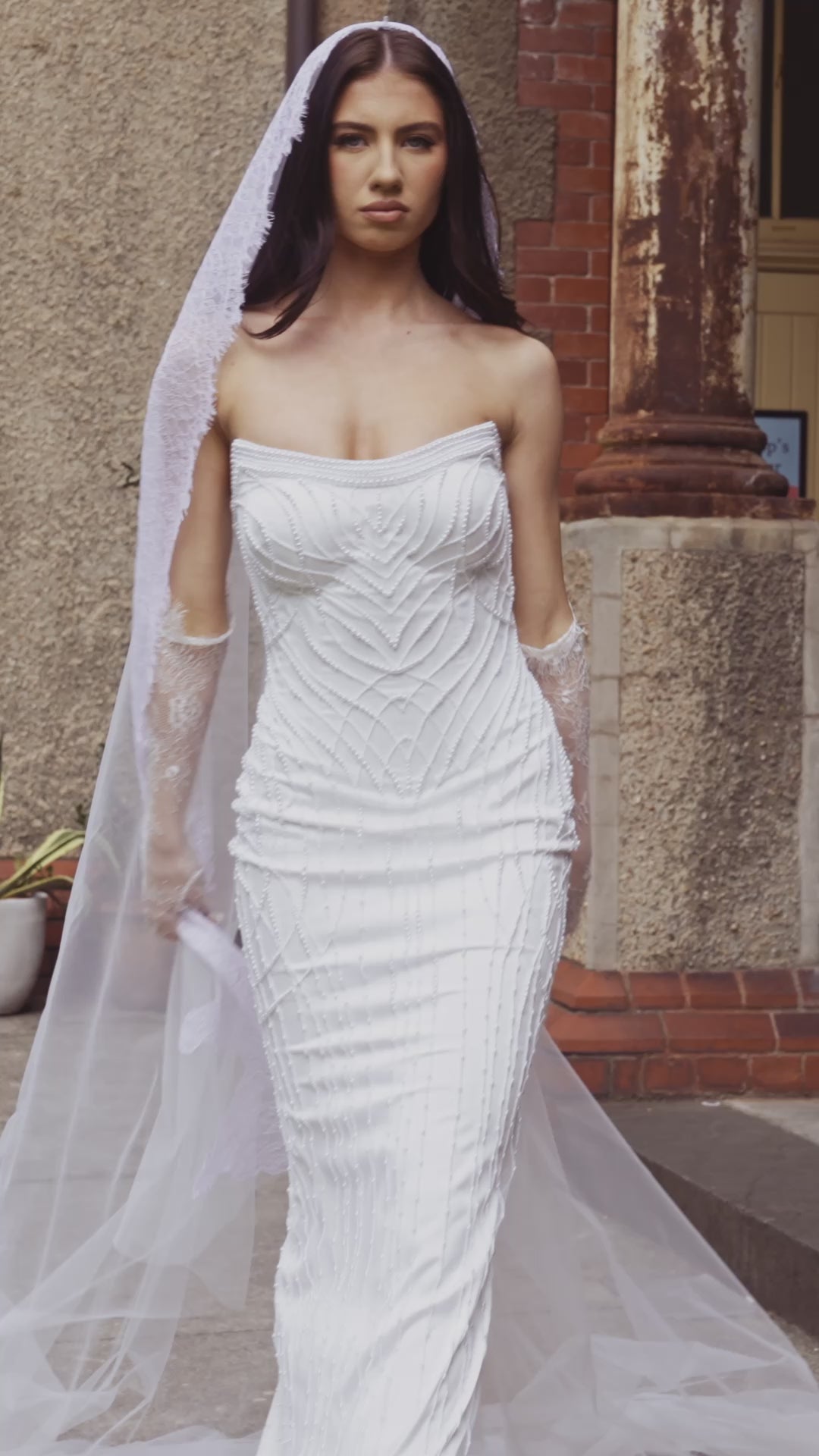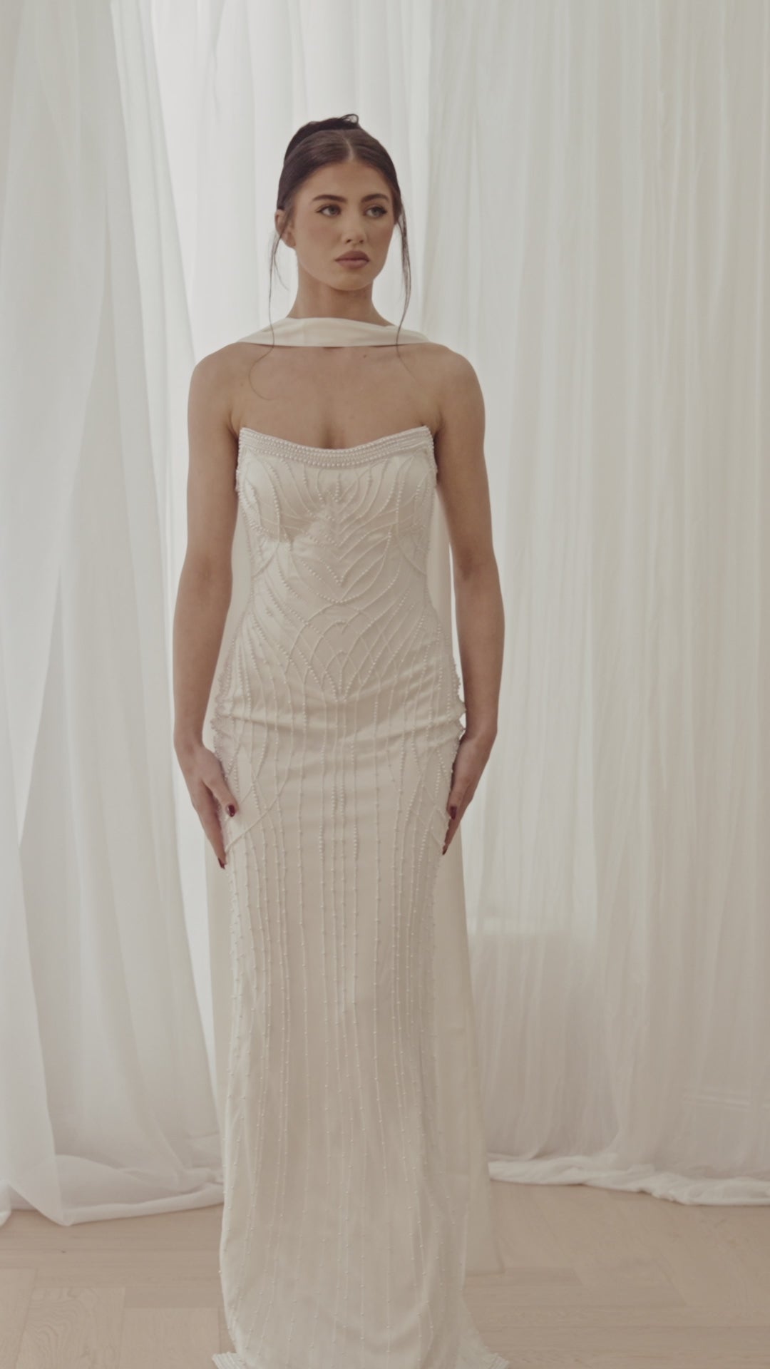 Sleek, sculptural, and endlessly refined, the Clarisse gown is a modern masterpiece. Cut in a clean, strapless silhouette, it is entirely hand-embellished with tonal beading that draws the eye along the body's natural contours. The structured bodice features a subtle curve that frames the neckline, while the column skirt falls fluidly to the floor. Designed to pair seamlessly with the Odette skirt or stand alone in minimalist sophistication, Clarisse is the epitome of contemporary bridal elegance.