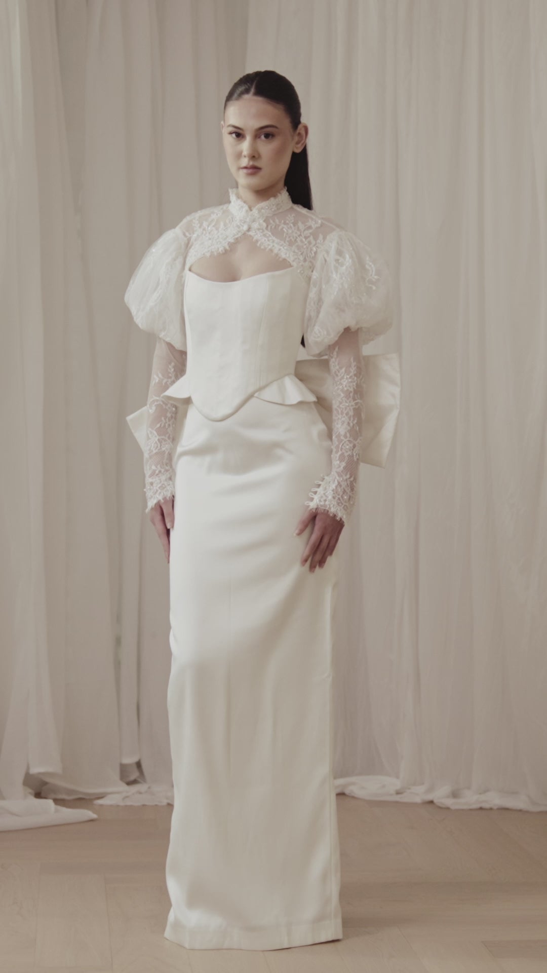 The Fleurine bow is a delicate detachable accent, crafted in lustrous silk satin to frame the back of your gown with romantic softness. Minimal yet striking, it transforms clean-lined silhouettes with a fluid couture flourish, balancing modern restraint with timeless femininity.
