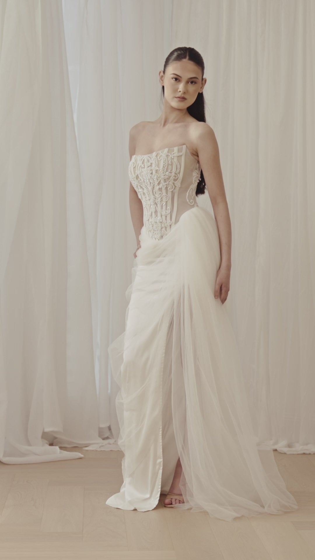Isolde is a vision of ethereal modernity, where translucent layers meet architectural detailing. The strapless corset bodice is structured with sheer paneling and hand-applied embroidery, creating the illusion of sculpted light. Draped tulle cascades diagonally across the hips into a high slit, revealing both leg and movement with striking confidence. Airy, sensual, and unapologetically bold, Isolde is crafted for the bride who commands presence with grace.