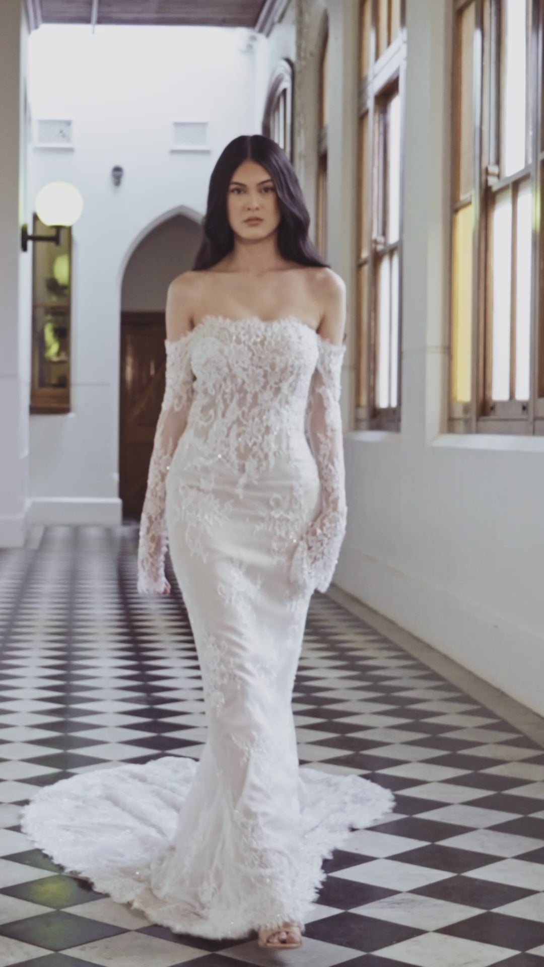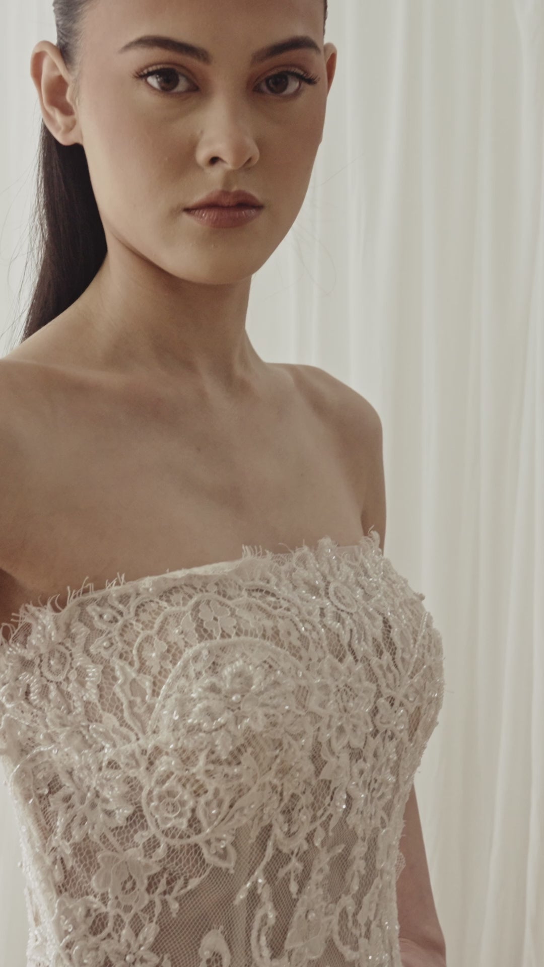 Marcelline embodies romance in motion, a graceful silhouette that blends modern minimalism with timeless lace artistry. The gown features a fitted strapless bodice that flows seamlessly into a chapel-length train, its surface adorned with hand-appliquéd lace motifs that seem to float across the fabric. Detachable illusion lace sleeves with couture cuffs allow the bride to transform her look from ceremony to reception, making Marcelline both versatile and unforgettable.